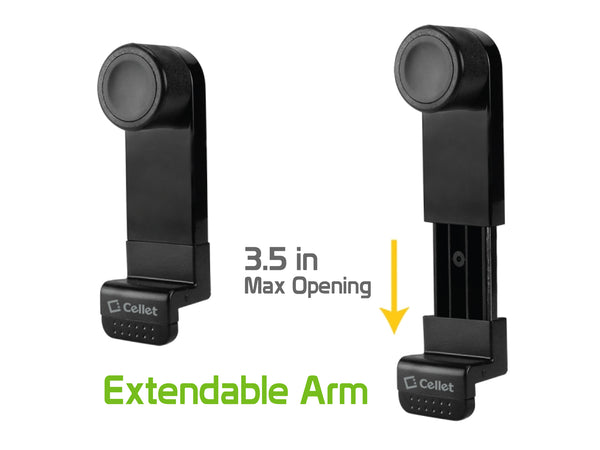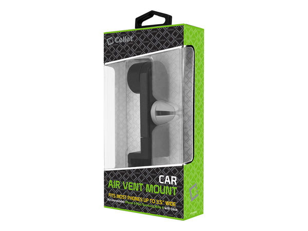 Mount your phone in your car without blocking driving visibility with the Cellet Car Air Vent Phone Holder. Featuring a simplistic design, this phone holder is easy to install; just insert the phone holder into the air vent and it will mount securely. The spring arms can accommodate phones up to 3.6 in. max and be positioned either vertically or horizontally. Suitable for Samsung S6, S6 Edge, S5, Note 5, HTC One, and other similar sized devices.