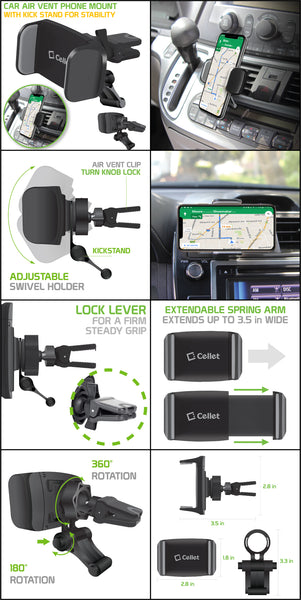 Upgrade your drive with this durable and fully adjustable Car Air Vent Phone Mount. Designed with a stabilizing kickstand, turn-knob lock, and 360° rotation, this holder keeps your device steady and within view. Its extendable spring arm fits most smartphones up to 3.5 inches wide, making it compatible with the latest iPhones, Samsung Galaxy models, and more. Whether you're navigating or streaming music, this cradle ensures safe, hands-free convenience on the road.