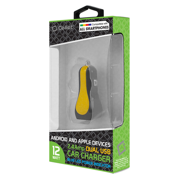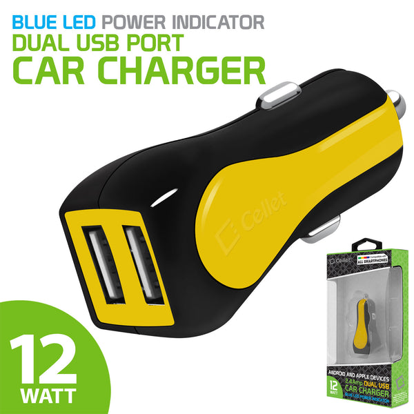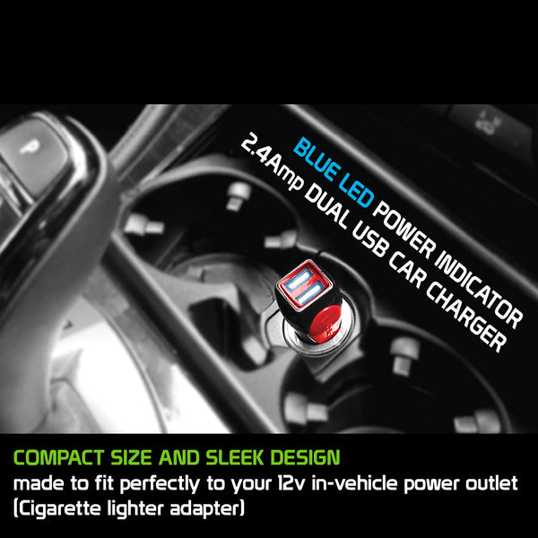 With its sleek compact design, it provides easy access to your USB ports while plugged into your car cigarette outlet and the blue LED light indicator shows that your device is plugged in and charging. Charger provides 12Watt (2.4Amp) of power that can charge up (to two) smartphones at the same time or a tablet with a smartphone and the built-in smart IC chip technology prevents your device from over-current, overcharging, and overheating. Universal dual USB ports allow you to use existing USB charging cables to charge your Apple, Android, or any USB-powered device at the same time. (USB cable sold separately)