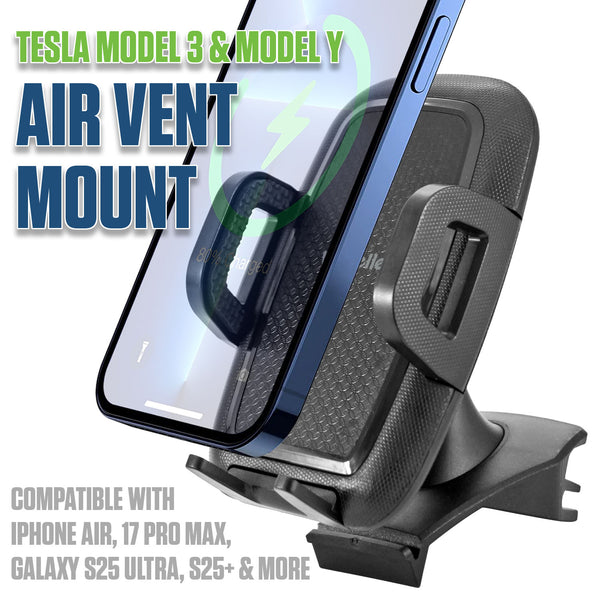 Upgrade your Tesla driving experience with this Air Vent Phone Mount, custom-designed for Model 3 and Model Y. The mount securely clips onto the vent, keeping your smartphone at eye level for safe navigation and hands-free use. Its 360° rotation allows perfect angle adjustment, while the non-slip rubberized arms firmly hold your device in place. Compatible with most smartphones, including iPhone, Samsung Galaxy, and Google Pixel, this mount installs in seconds with no tools required. A perfect blend of functionality and style for your Tesla.