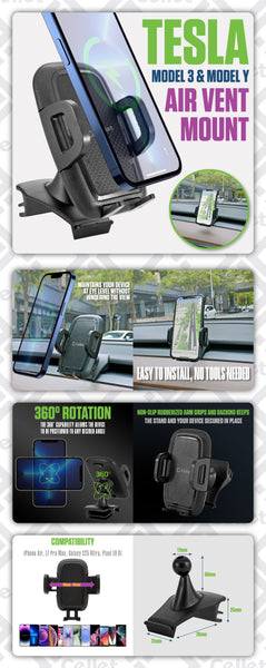 PH240 - Cellet Tesla Model 3 & Model Y Air Vent Phone Mount, 360° Rotation Car Phone Holder, Non-Slip Clamp Cradle, Dashboard Vent Clip Cell Phone Stand Compatible with iPhone 15 14 13 Pro Max, Samsung Galaxy, Pixel