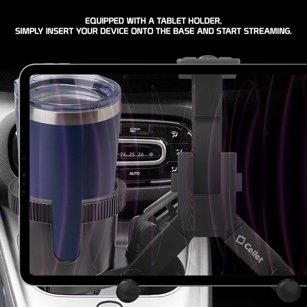 Securely mount your tablet when on the go with the Cellet tablet cup holder mount. The mount has a 360 degree rotation capability which allows you to view your device in portrait or landscape mode. Equipped with a built in cup holder, the mount does not limit your space for your waterbottles. Heavy duty adjustable base fits most cup holders. Insert base into cup holder, if base is too small, turn dial counterclockwise to extend wings to fit into your cup holder. To reduce extended wings, turn dial clockwise. You can remove and mount this holder onto any car or reposition at any time