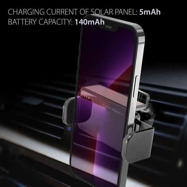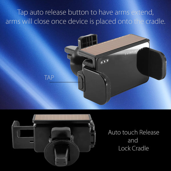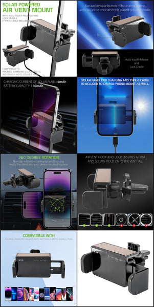 PHSOL188 - Cellet Solar Powered Car Phone Mount for Air Vent – Auto Touch Release & Lock Cradle, 360° Rotation, USB-C Powered (No Phone Charging) – Compatible with iPhone, Samsung, Pixel, Motorola
