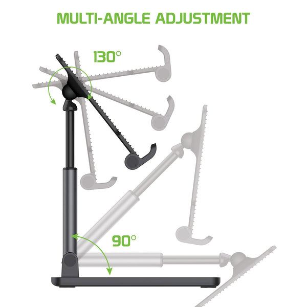Place the holder onto any table, desk, or flat surface to enjoy watching your favorite shows or review your favorite recipe on your tablet/smartphone with ease using the smartphone and tablet display stand. Constructed with high-quality aluminum and equipped with a non-slip weighted base for enhanced stability. Non-slip rubberized silicone backings were added to the cradle for extra protection to maintain a secure grip on your device. With a 130-degree tilt rotation and height adjustment of 3.35-6.1 inches, it offers multiple viewing positions. It also offers two viewing angles, portrait or landscape orientation.