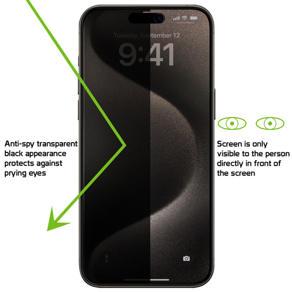 Protect your iPhone 15 Pro Max screen from prying eyes with the Cellet Premium Tempered Privacy Glass Screen Protector. Precisely cut for your iPhone 15 Pro Max, the screen provides the ultimate protection for your screen without hindering touchscreen capabilities. Each tempered glass screen protector provides 9H hardness strength with minimal thickness, and scratch-proof protection, and its oleophobic coating provides resistance against smudges and fingerprints. Featuring a transparent black appearance for extra privacy, the screen can only be viewed at a straight angle and prevents others from looking at your phone. Simple to install, the package includes an alcohol wipe, a microfiber cloth, and instructions to assist in the application of the screen.