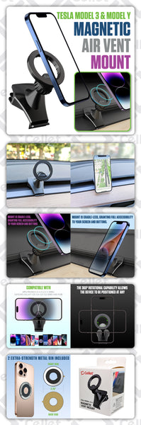 Upgrade your Tesla driving experience with the Cellet Magnetic Air Vent Phone Mount, designed specifically for Tesla Model 3 & Model Y. Its powerful magnetic grip and cradle-less design provide secure, hands-free phone use while keeping your screen and buttons fully accessible. Enjoy 360° rotation for perfect viewing angles, plus included extra-strength metal rings for enhanced compatibility with iPhone and Samsung devices.