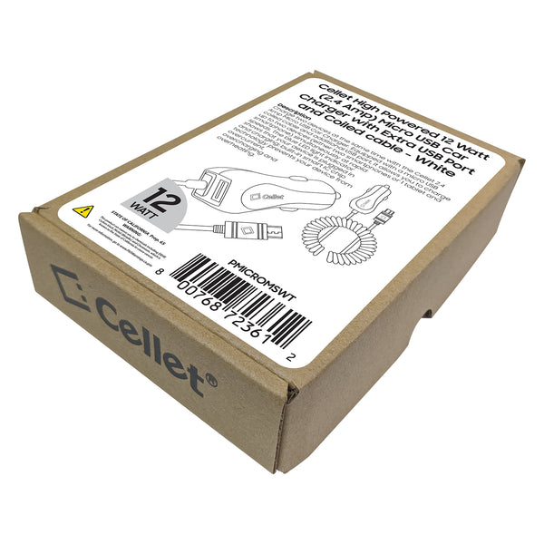 PMICROMSWT - Cellet High Powered 12 Watt (2.4 Amp) Micro USB Car Charger with Extra USB Port and Coiled cable - White