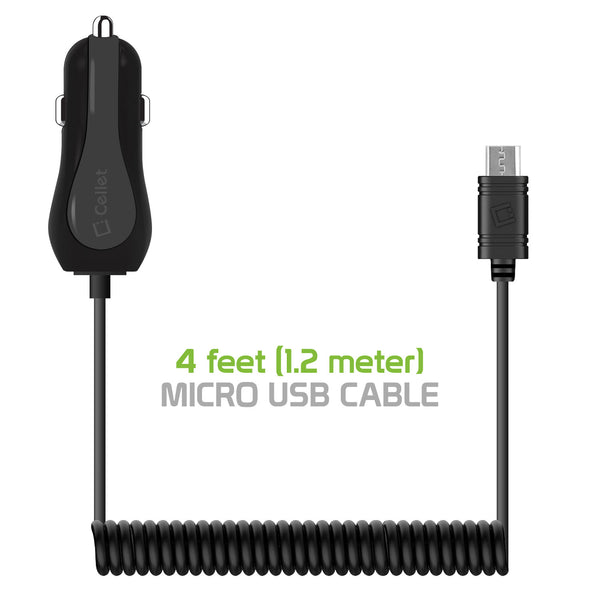 Charge two devices at the same time with the Cellet 2.4 Amp Micro USB Car Charger. Equipped with a micro USB coiled cable and additional USB port, it allows you to charge up to two devices (either two smartphones or 1 tablet and smartphone) simultaneously at rapid speeds. The blue LED light indicator shows that your device is plugged in and charging; built-in smart IC chip technology prevents your device from overcurrent, overcharging, and overheating.