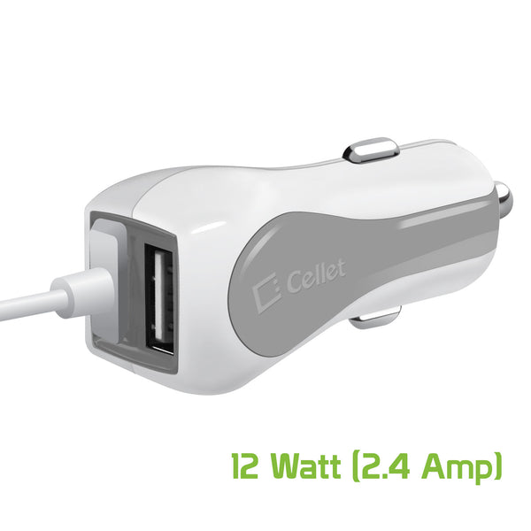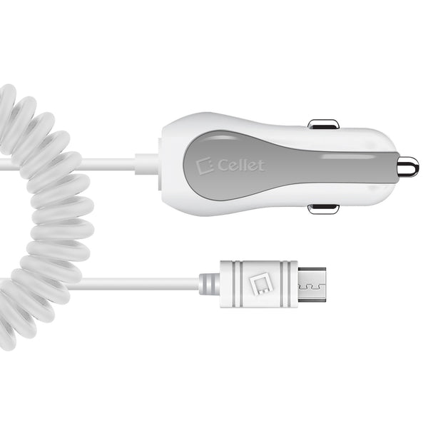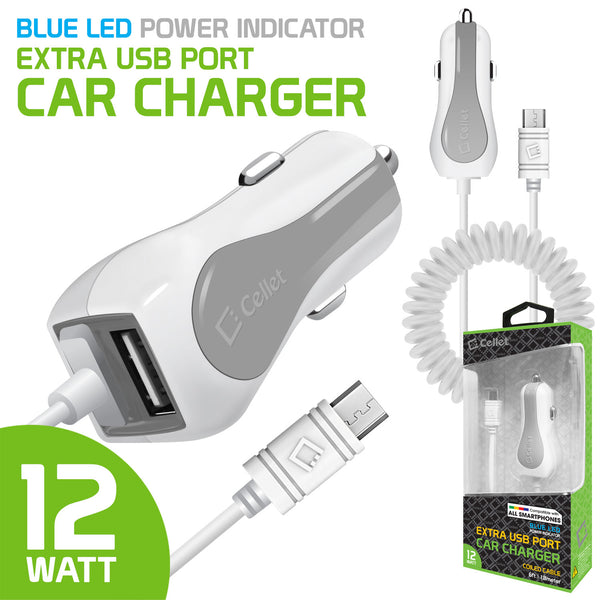 PMICUM21WT - Cellet High Powered 12 Watt (2.4 Amp) Micro USB Car Charger with Extra USB Port and Coiled cable - White
