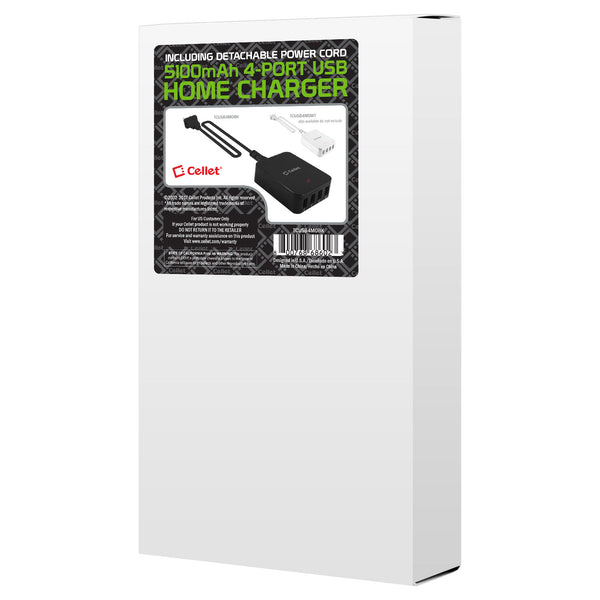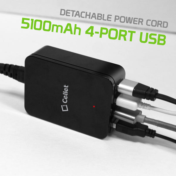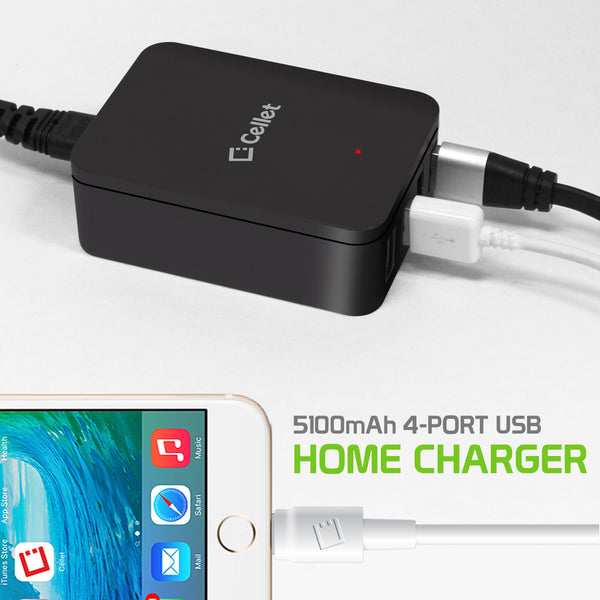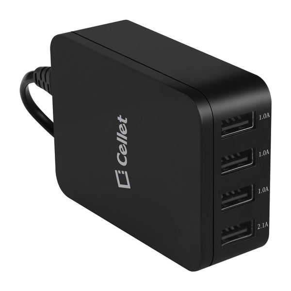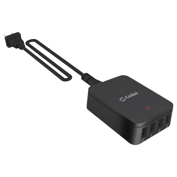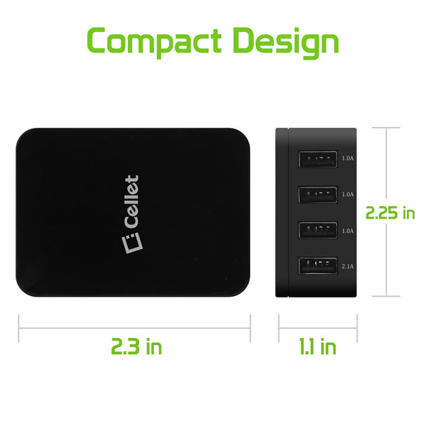 Charge up to four (4) devices simultaneously with the Cellet 4-Port Travel Wall Charger. Featuring one 10Watt (2Amp) port and 15Watt (3.1Amp) ports, this rapid charging power source can charge your tablet and 3 other USB-ready electronic devices to its maximum charging capability at the same time without sharing the full 5 amps. With its convenient compact size, it is the perfect charging hub for your workstation whether at home or at the office. Compatible with all iPhones, iPads, Samsung S3/S4/S5/Note 2 &3, HTC One, digital cameras, and any other USB cable-ready devices.