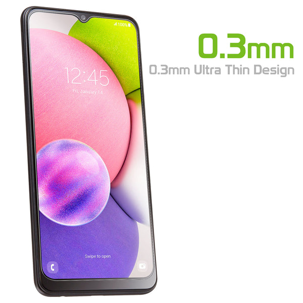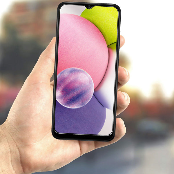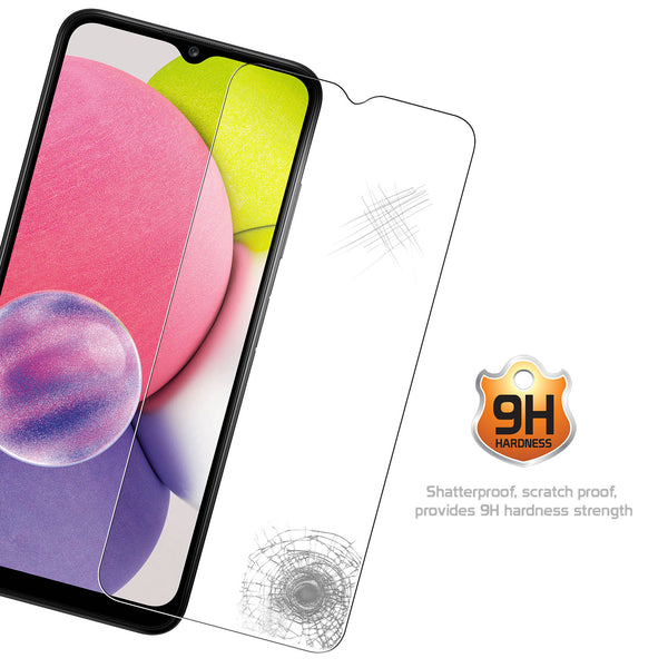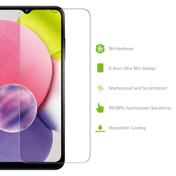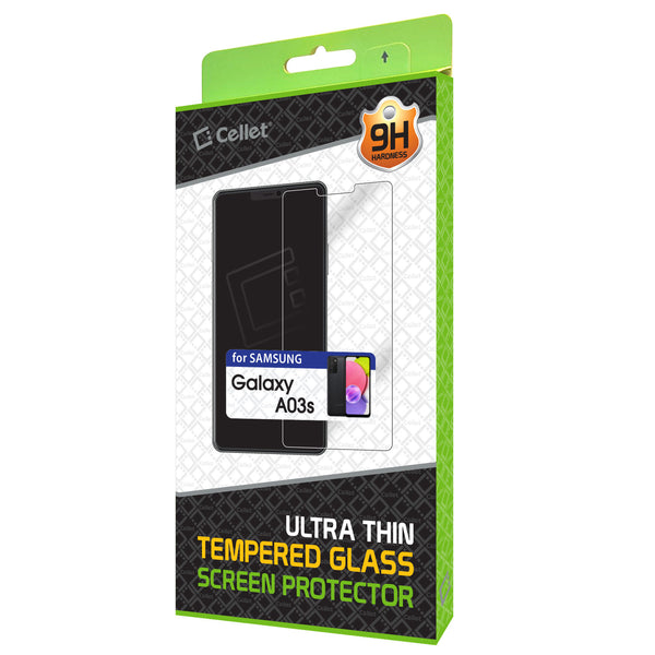 Protect your Samsung Galaxy A03s screen with the Cellet Premium Tempered Glass Screen Protector. Precisely cut for the Samsung Galaxy A03s, the glass screen provides the ultimate protection for your screen without sacrificing touchscreen capabilities. Each tempered glass screen protector provides 9H hardness strength with minimal thickness, offering scratch-proof protection without added space and its oleophobic coating gives resistance against smudges and fingerprints. Simple to install, the package includes an alcohol wipe, blue film, microfiber cloth, and sticker directions to assist in the application of the screen.