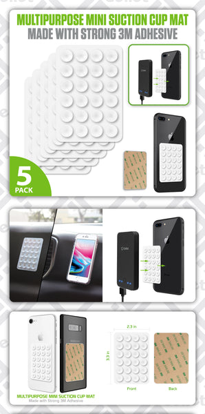 Experience versatile holding power with the Cellet Multipurpose Mini Suction Cup Mat. Designed with strong 3M adhesive and a compact 2.3” x 3.3” size, these suction mats securely attach to dashboards, walls, portable chargers, and more. Perfect for travel, office, or home use, each mat offers a clean, residue-free grip that’s heat-resistant and reusable. Comes in a convenient 5-pack for multiple uses.