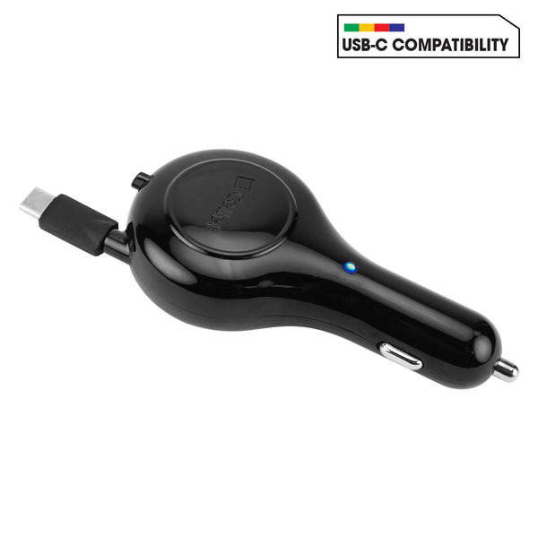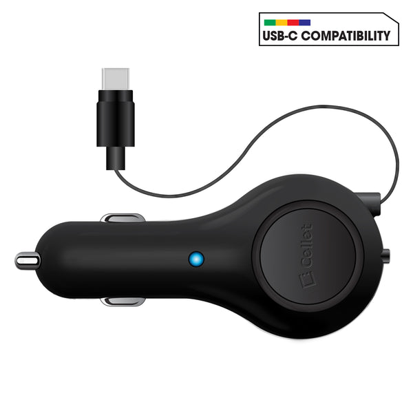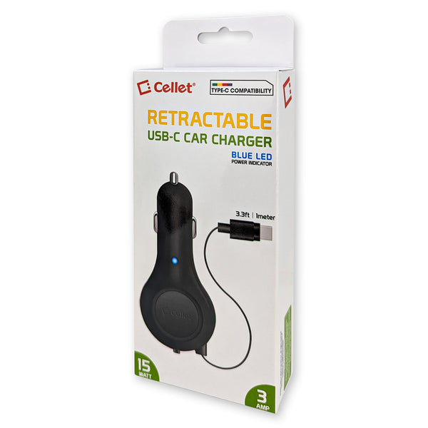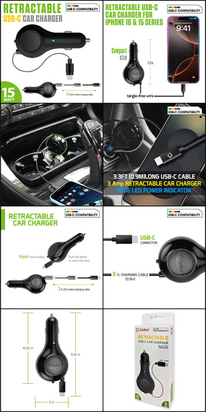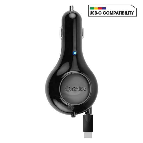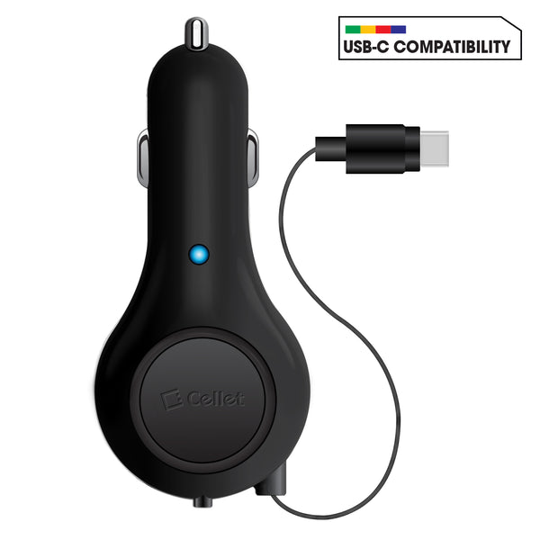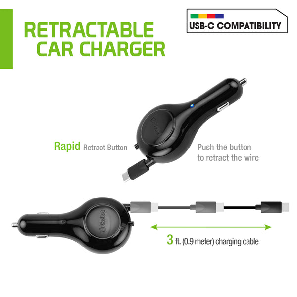 Stay charged and organized with the Cellet Retractable USB-C Car Charger, engineered for convenience and power. With 15W rapid charging and a built-in retractable 3.3ft USB-C cable, this charger is perfect for Apple iPhone 15/16 series and all other Android USB-C devices. A simple button retracts the cable instantly, and the compact design ensures it fits in any vehicle. The blue LED indicator provides a soft glow to confirm power connection without distraction. Ideal for daily commutes, road trips, and on-the-go charging.
