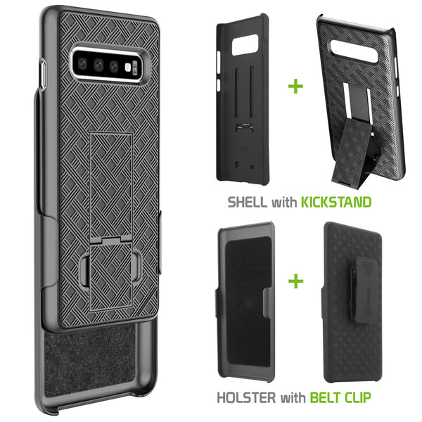Combining protection with functionality, this shell plus holster case lets you carry your device with ease while providing maximum all-around protection. Built-in media kickstand on the holster and shell allows viewing in landscape (horizontal) or portrait (vertical) orientation and the heavy-duty clip has 180-degree rotation. Rubberized finish and cross-checkered design act as an extra precautionary step against accidental cosmetic damage. The slim profile and the multi-functionality of this product merge style, versatility, and superior protection.