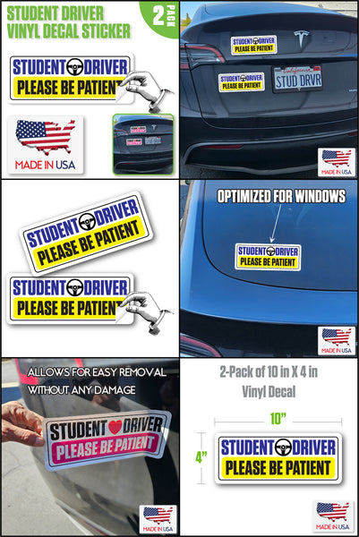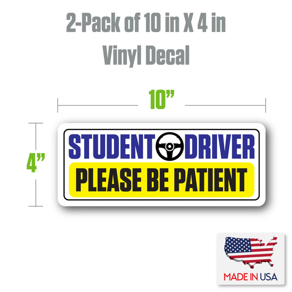 SKSDYL - Student Driver Vinyl Decal Sticker – 2 Pack (10" x 4") – Weatherproof, Easy-Remove – "Please Be Patient" Safety Sign – Made in USA
