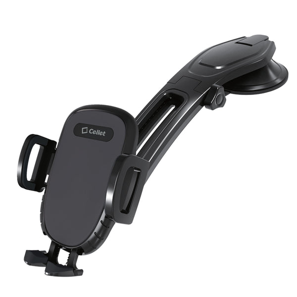 - Suction cup with a lock lever secures the base onto your dashboard or windshield. This phone holder will securely hold your phone with confidence and no difficulties as you drive.