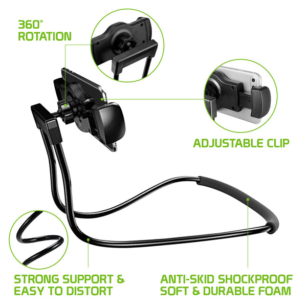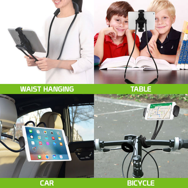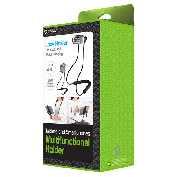 Watch videos or movies, play games, or video chat comfortably with Cellet's Lazy Holder. Hang the lazy holder on your neck and watch movies comfortably as you lay down. The soft foams protect your neck and waist from any discomfort. You can also watch videos as you sit on the couch by hanging the holder onto your waist. The lazy holder has multiple uses, it can also be used as a selfie stick, bicycle mount, backseat headrest holder, or a table mount. The lazy holder allows you to free your hands, sit back and enjoy your movie. It is compatible with most smartphones, iPads, and tablets up to 4-10 inches.