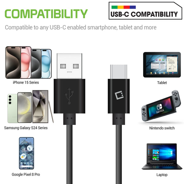 Obtain the content in your device with our cleverly designed USB-C data cable. Sync and transfer your files from your computer to your device or charge your device or vice versa. High power (2.4Amp) availability to charge your device with an AC wall adapter (not included) at a rapid rate. USB-C to USB-A cable simplifies your connection, simply plug the cable into your phone and transfer content easily. The cable length of 3.3ft offers freedom to connect your device to a wall charger or to your laptop. This cable is compatible with smartphones, tablets, cameras and other USB-C enabled devices.