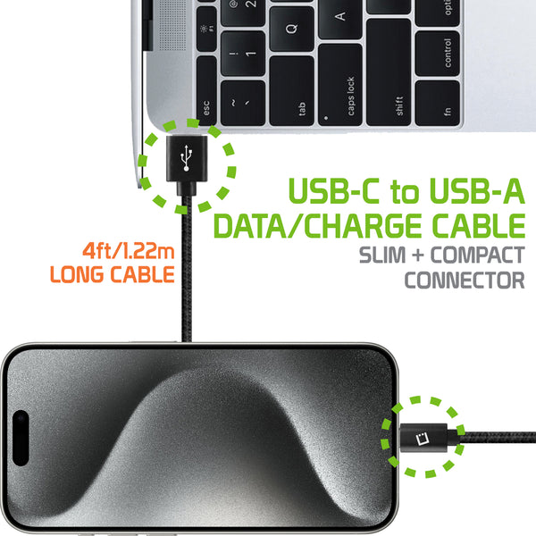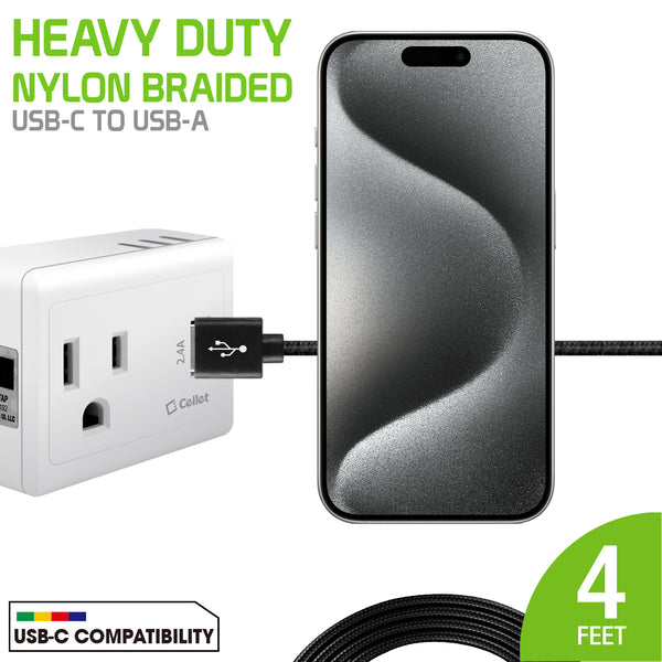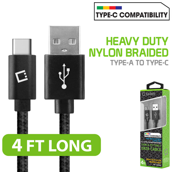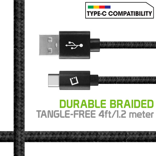 Transfer/sync/charge your USB-C compatible device to your computer with the Cellet USB-A to USB-C Charging Data Sync Cable. Featuring a reversible USB-C connector, it can be inserted into a compatible port in any orientation and the durable nylon braided cable can withstand 5000+ bends. Plug the standard USB Type-A into a wall power adapter for rapid charging. Offering 480 Mbps data transfer speeds, it provides up to 3 amps charging output; perfect to connect your smartphone or tablet to your USB-C enabled device. Please note: this item is designed to work with smartphones and tablets only.