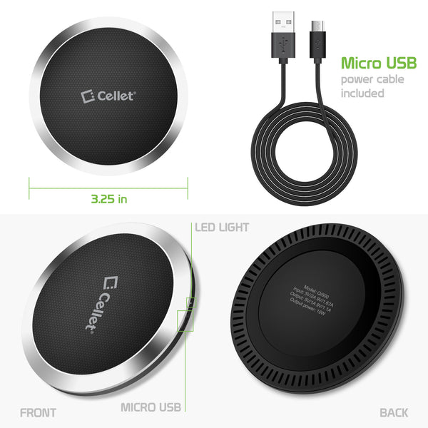 Featuring innovative technology, the Cellet Wireless Charging Pad allows you to quickly charge your QI-enabled device by simply placing your phone on the charging pad. The ultra-thin charging pad can be placed onto any flat surface without taking up much space and can easily be stored anywhere. This wireless charging made makes charging your device hassle-free and convenient. The red LED light indicates standby and the green led light indicates your device is charging. Plugin the Micro USB cable into your laptop, desktop, or AC adapter and begin charging. Please ensure that your device is wireless charging ready or has a wireless charging receiver installed to activate charging.