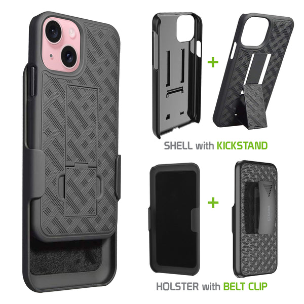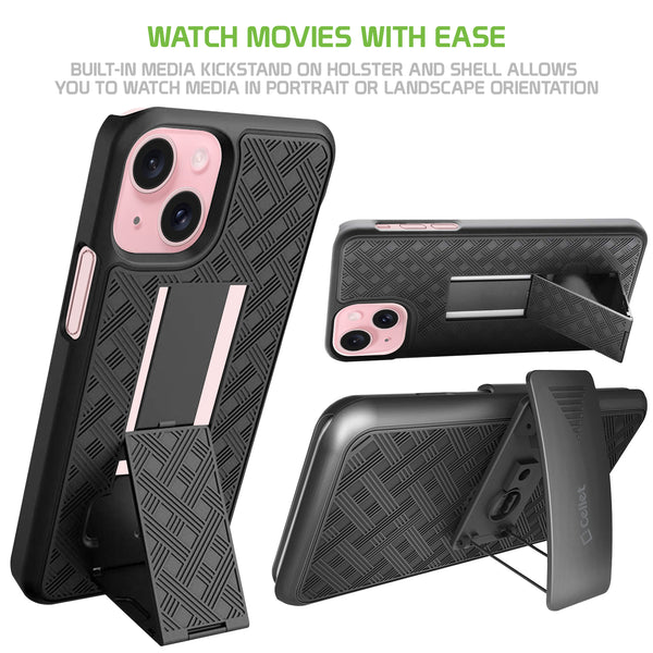 Combining protection with functionality, this shell plus holster case allows you to carry your device with ease while providing maximum all-around protection. Built-in media kickstand allows viewing in landscape (horizontal) or portrait (vertical) orientation. The case easily slips into the heavy duty holster, so you can carry your phone either face up or face down. In addition, the belt clip includes 180-degree rotation capability so you can position the holster at any desired angle. The holster and hard shell combo case comes in all black and contains TPU, rubberized soft coating, which aids as an extra step of precaution against accidental cosmetic damage. Look no further! The slim profile and the multi-functionality of this product merge style, versatility, and supreme protection.