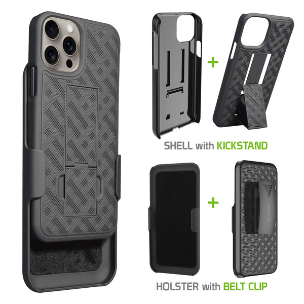 Combining protection with functionality, this shell plus holster case allows you to carry your device with ease while providing maximum all-around protection. Built-in media kickstand allows viewing in landscape (horizontal) or portrait (vertical) orientation. The case easily slips into the heavy-duty holster, so you can carry your phone either face up or face down. In addition, the belt clip includes 180-degree rotation capability so you can position the holster at any desired angle. The holster and hard shell combo case comes in all black and contains TPU, rubberized soft coating, which aids as an extra step of precaution against accidental cosmetic damage. Look no further! The slim profile and the multi-functionality of this product merge style, versatility, and supreme protection.